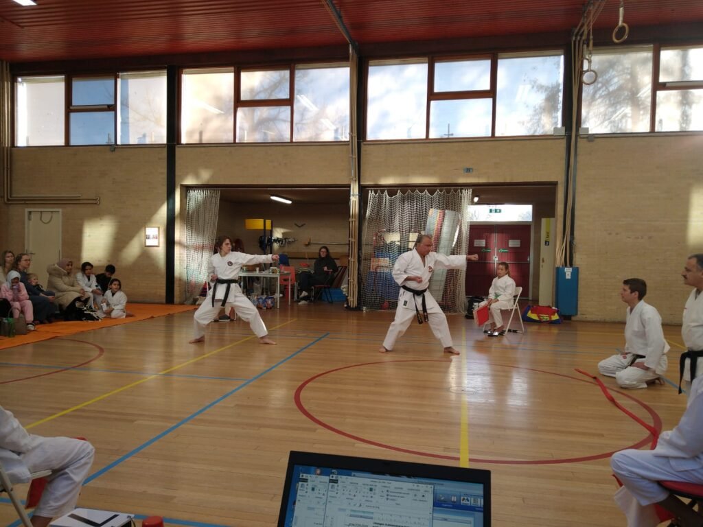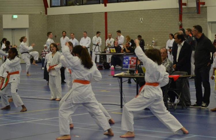 Tussen de wedstrijden door werd er ook een kleine vriendschappelijke vlaggen kata wedstrijd gehouden tussen de instructeurs en waarbij de jeugdleden mochten beoordelen wie er zou winnen.